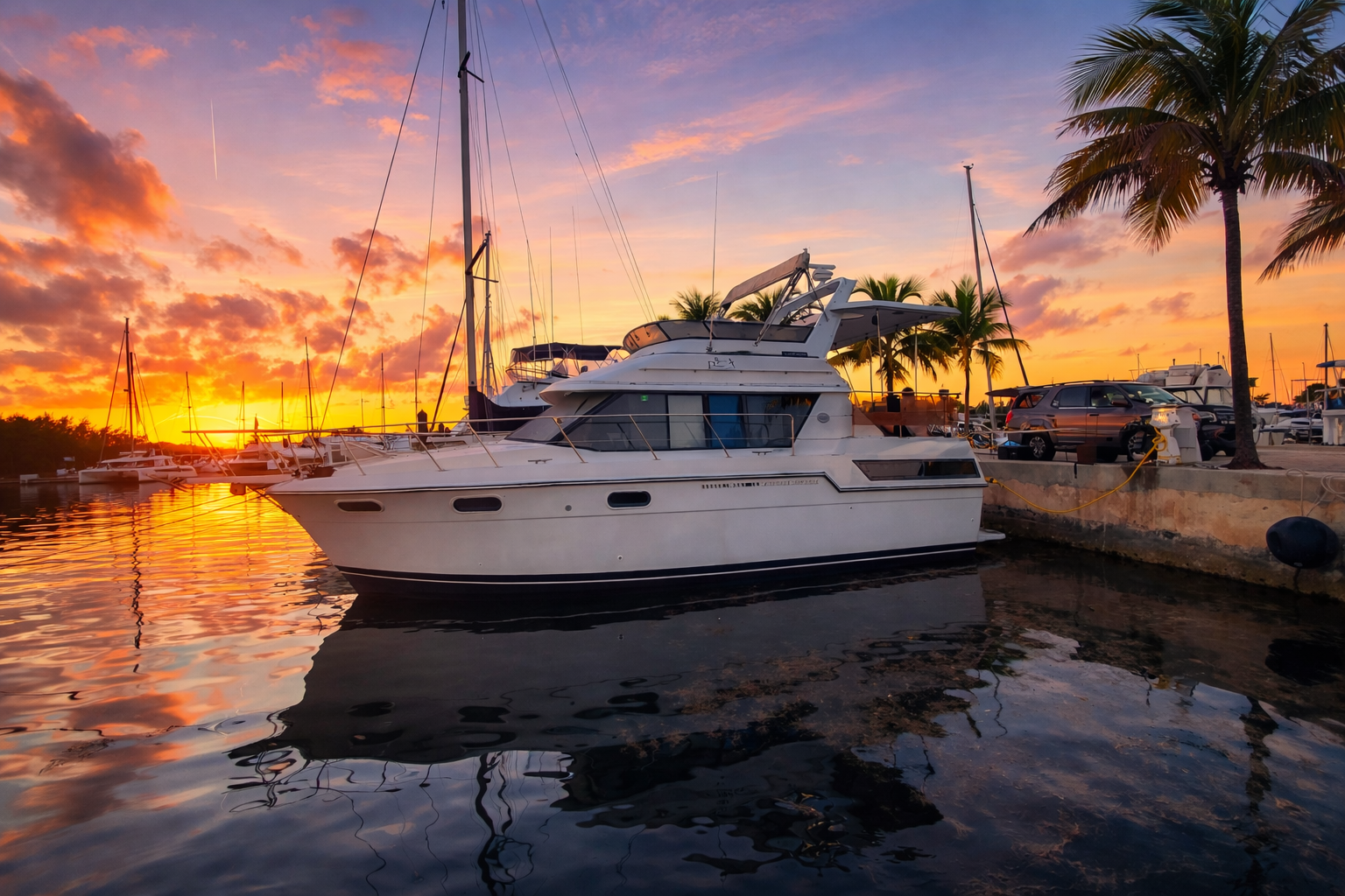 A docked yacht experience with marina views, sunset skies, and easy access to downtown Key West